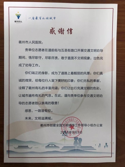 【創(chuàng)文進行時】市創(chuàng)建辦為“有禮”的衢醫(yī)人送來感謝信