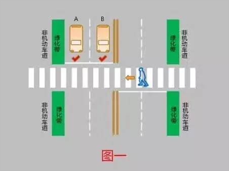圖一:行人在道路右幅人行橫道行走、未抵達(dá)道路中心線時(shí),在左幅道路行駛的機(jī)動(dòng)車A、B應(yīng)當(dāng)減速行駛,可在確保安全的前提下通過人行橫道。
