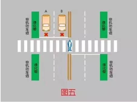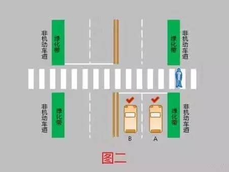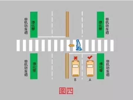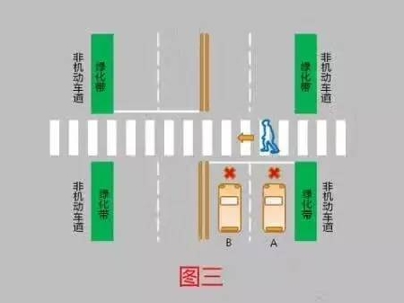 圖三:行人越過機(jī)動(dòng)車道、非機(jī)動(dòng)車道分隔線,進(jìn)入上述位置,機(jī)動(dòng)車A、B未停車讓行的,屬于違法行為。