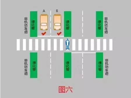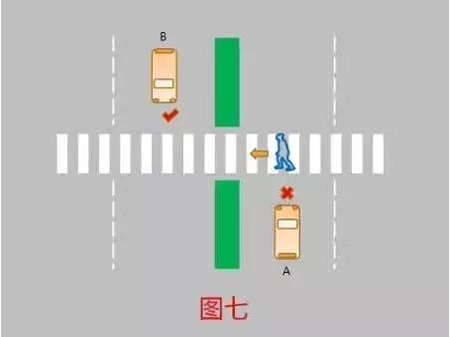 圖六:道路中央采用綠化帶隔離,行人在道路中央駐足區(qū)等待的,機(jī)動(dòng)車A、B應(yīng)當(dāng)減速行駛,可在確保安全的前提下通過人行橫道。