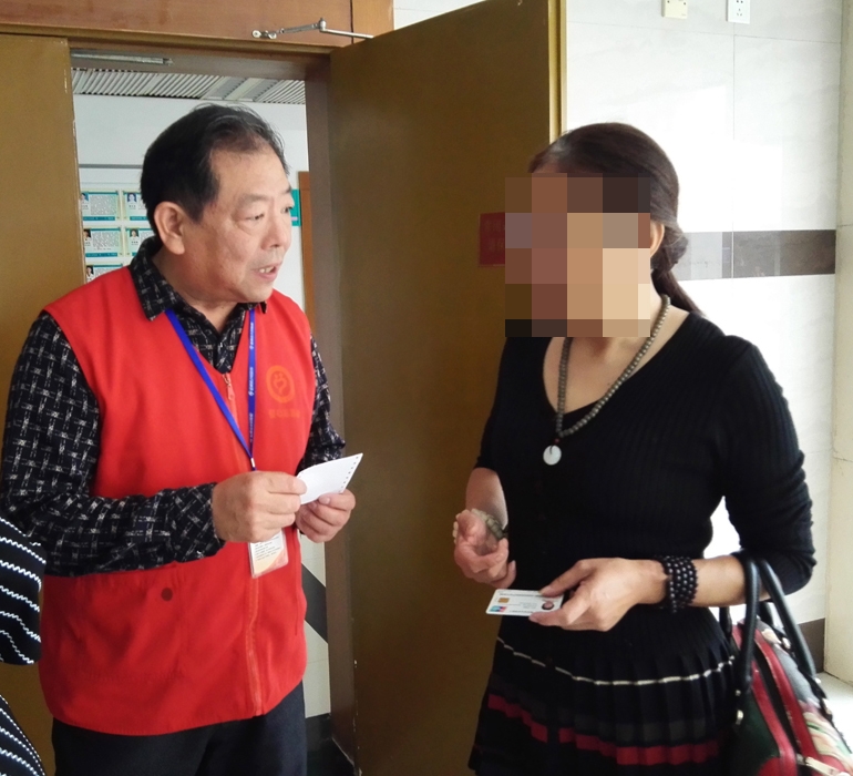 ??? 王建中的小姨子董亞玲是志愿者隊伍里的新成員,看到姐夫王建中、姐姐董健玲在志愿者崗位上忙的不亦樂乎,小姨子董亞玲也動了心。一個月前,她也來到衢州市人民醫(yī)院愛心志愿者服務(wù)中心報名,當起了志愿者。