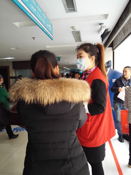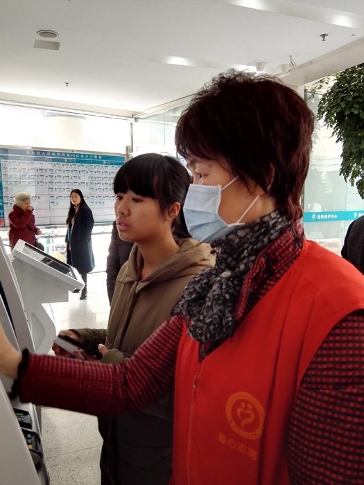 ??? 翁文淵、繆惠芳、王琍穎、葉根倪、豐學(xué)謙、陳彩英、葉麗婷、陸佳佳、鄭紅燕、賴如平、朱楊帆、蘇秀萍、徐幼平、范華欣、王莉、陳根清等16人在衢州市人民醫(yī)院做志愿者,主要來自社會(huì)志愿者和本院志愿者。 志愿者們主要為患者指路引導(dǎo),陪伴行動(dòng)不便、年老體弱患者就診,指導(dǎo)患者自助服務(wù)機(jī)使用方法,引導(dǎo)患者化驗(yàn)前取號(hào)、打印化驗(yàn)單,協(xié)助門診大廳工作人員疏導(dǎo)病人。