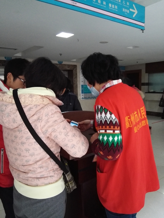 ??? 洪波、王建中、王金妹、王宇寧、胡曉芬、楊君梅、張俊晴、任紅、孫平平、章建霞、周華、周妮、金菊仙、杜長寶、傅亞靈、陸佳佳、葉麗婷等17人在衢州市人民醫(yī)院做志愿者,主要來自社會(huì)志愿者和本院志愿者。 志愿者們主要為患者指路引導(dǎo),陪伴行動(dòng)不便、年老體弱患者就診,指導(dǎo)患者自助服務(wù)機(jī)使用方法,引導(dǎo)患者化驗(yàn)前取號(hào)、打印化驗(yàn)單,協(xié)助門診大廳工作人員疏導(dǎo)病人。