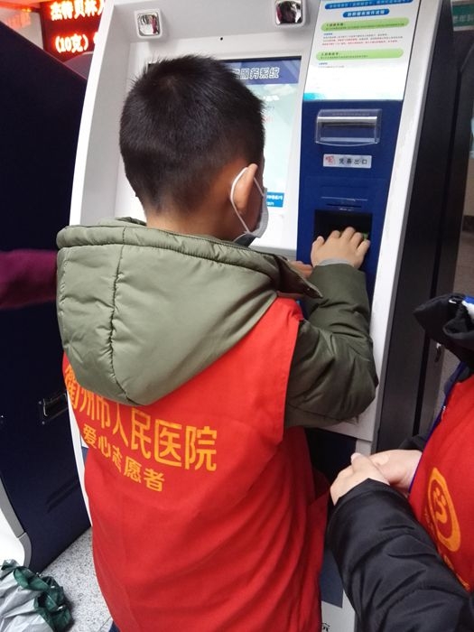 ??? 李興江、余照坤、徐家梅、陳安琪、翁文淵、洪波、徐倞舟等7人在衢州市人民醫(yī)院做志愿者,主要來自寒假學(xué)生志愿者。 志愿者們主要為患者指路引導(dǎo),陪伴行動不便、年老體弱患者就診,指導(dǎo)患者自助服務(wù)機使用方法,引導(dǎo)患者化驗前取號、打印化驗單,協(xié)助門診大廳工作人員疏導(dǎo)病人。