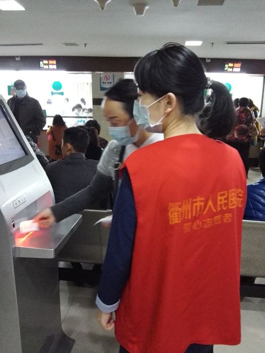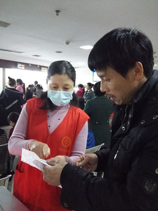 ??? 王金妹、周素珍、潘正照 、譚惠娟、張?jiān)缕?、陳秀花、黃卉等7人在衢州市人民醫(yī)院做志愿者,主要來自社會志愿者和本院志愿者。 志愿者們主要為患者指路引導(dǎo),陪伴行動不便、年老體弱患者就診,指導(dǎo)患者自助服務(wù)機(jī)使用方法,引導(dǎo)患者化驗(yàn)前取號、打印化驗(yàn)單,協(xié)助門診大廳工作人員疏導(dǎo)病人。