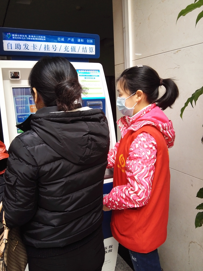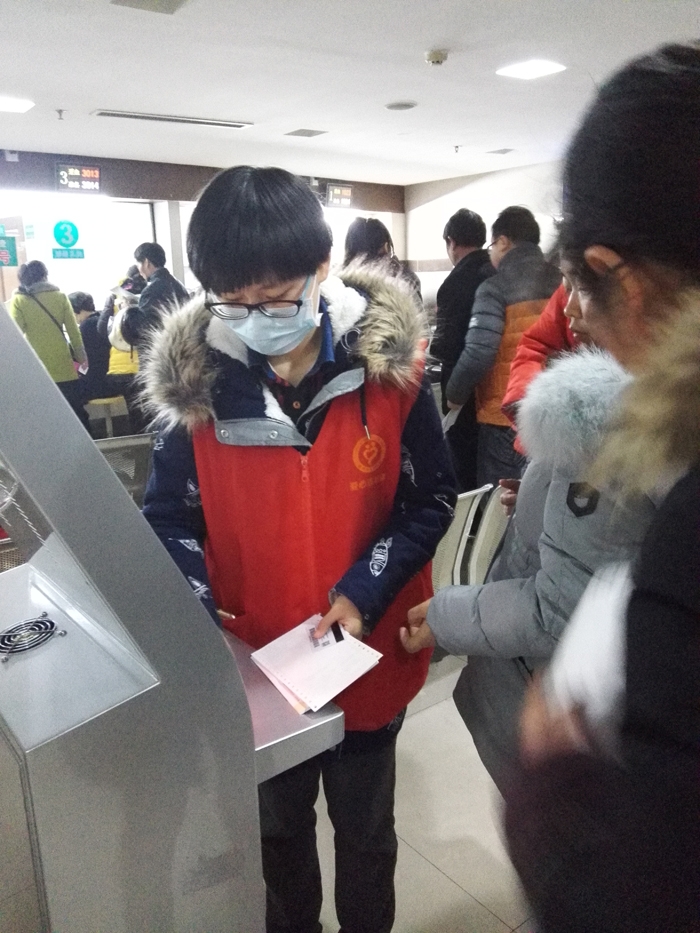 ??? ?徐鑫洋、湯美娟、湯玉卿、陳夏雯、徐嘉妮、葉佳怡、周育存、汪潔瓊、李興江、余照坤、徐家梅、彭紫媛、陳安琪等13人在衢州市人民醫(yī)院做志愿者,主要來自寒假學(xué)生志愿者。 志愿者們主要為患者指路引導(dǎo),陪伴行動不便、年老體弱患者就診,指導(dǎo)患者自助服務(wù)機(jī)使用方法,引導(dǎo)患者化驗前取號、打印化驗單,協(xié)助門診大廳工作人員疏導(dǎo)病人。