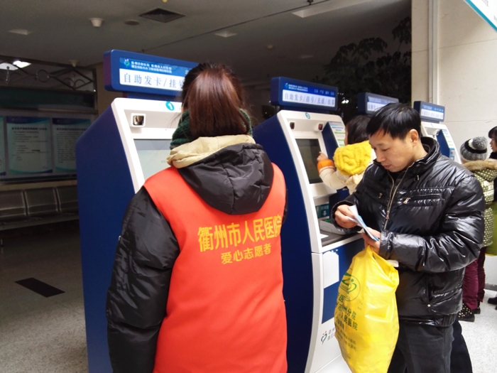 ??? 吳暢、王宜、祝文斌、羅霽萍、吳琛凱、劉翌純、陳侃琪、吳利婷、毛豐怡、毛佳雯、汪鄭妙、朱夢珂、鄭思綺、徐諾、王慧佳、廖周佳、周穎等17人在衢州市人民醫(yī)院做志愿者,主要來自寒假學生志愿者, 志愿者們主要為患者指路引導,陪伴行動不便、年老體弱患者就診,指導患者自助服務機使用方法,引導患者化驗前取號、打印化驗單,協(xié)助門診大廳工作人員疏導病人。