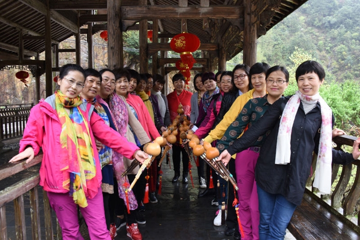 ??? 雨天出行,讓我們見識(shí)了七里的別樣風(fēng)景:龍?zhí)镀俨嫉膲延^、石梁溪的一瀉千里、七里山脈的云霧繚繞……受美景的影響,會(huì)員們情不自禁地取出葫蘆絲,依著龍?zhí)独葮虼底嗥鹜疝D(zhuǎn)悠揚(yáng)的葫蘆絲樂曲。優(yōu)美的樂聲吸引了當(dāng)?shù)赜慰偷鸟v足圍觀,得到了大家的好評(píng)!