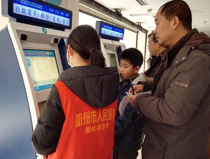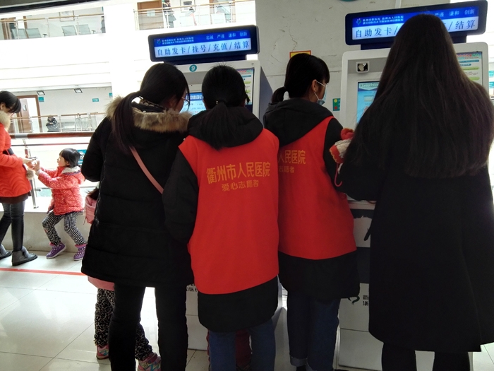??? 余慧晨、徐思惠、張莘陟、徐安琪、呂丹、陳玉瑩、徐怡、周孟穎、周慧娟、毛如意、鄭琦慧、葉佳蕓、王喬梅、王宇寧等14人在衢州市人民醫(yī)院做志愿者,主要來自寒假學(xué)生志愿者。 志愿者們主要為患者指路引導(dǎo),陪伴行動(dòng)不便、年老體弱患者就診,指導(dǎo)患者自助服務(wù)機(jī)使用方法,引導(dǎo)患者化驗(yàn)前取號(hào)、打印化驗(yàn)單,協(xié)助門診大廳工作人員疏導(dǎo)病人。