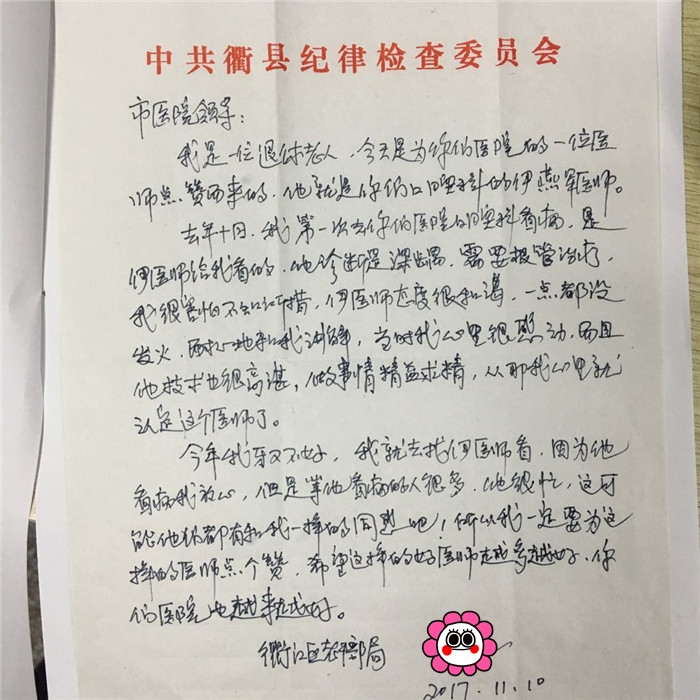 伊燕軍----衢江區(qū)老干部局退休老人為口腔科醫(yī)師送來(lái)感謝信 文章來(lái)源:宣聯(lián)處 作者: 點(diǎn)擊數(shù):9178 更新時(shí)間:2017-11-17 ??? 11月15日,衢江區(qū)老干部局的曾阿姨來(lái)到我院,把她寫(xiě)的一封感謝信親手交到醫(yī)院黨辦,以感謝為她看病的口腔科醫(yī)生伊燕軍。 ? ? 上一篇: 吳善水——第六屆“浙江省優(yōu)秀醫(yī)師獎(jiǎng)”獲得者 下一篇: 【衢醫(yī)有禮】近20年風(fēng)雨相伴,這位醫(yī)生和病患的關(guān)系超越了親人