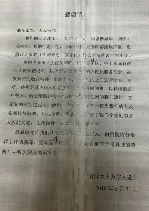 ??? “醫(yī)者父母心,市人民醫(yī)院內(nèi)分泌科胡朝暉主任,聶曉慶醫(yī)師和陳育群護(hù)士長不辭辛勞義務(wù)上門服務(wù),我們沒別的方式感謝,只想對他們說聲謝謝!”近日,沈大爺?shù)呐畠禾氐亟o醫(yī)院送來了一封感謝信。