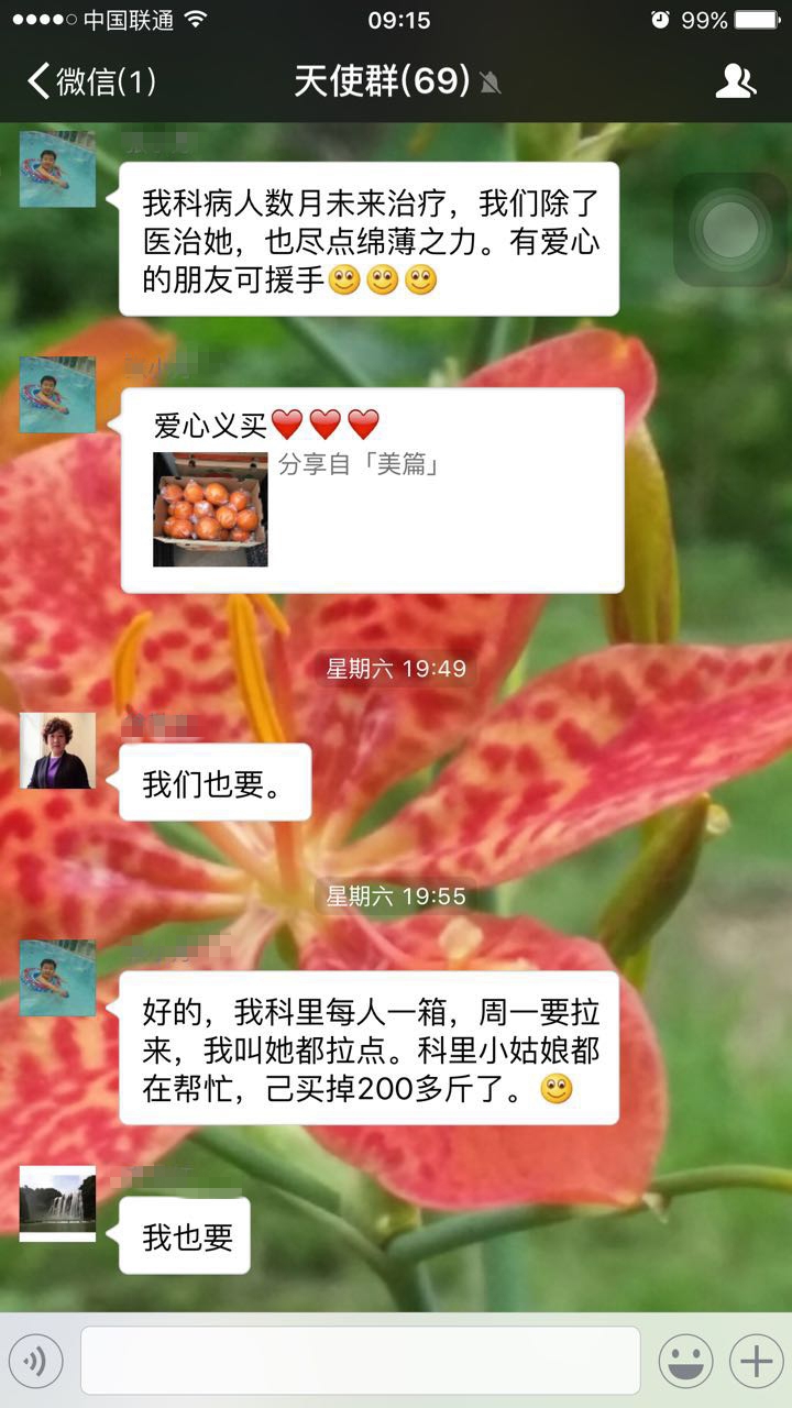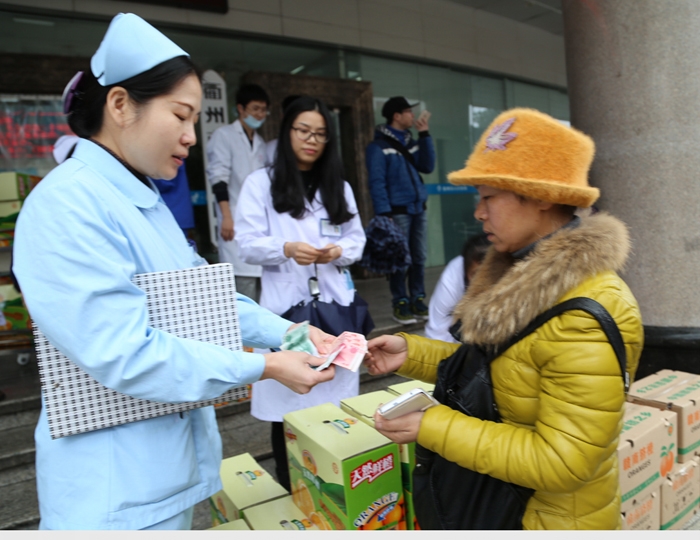 ??? 鄭勤紅一直關(guān)注著這個(gè)多難的家庭,得知此事后立即通過微信向院內(nèi)的醫(yī)護(hù)人員發(fā)出求助信息,消息一經(jīng)發(fā)出,院內(nèi)的醫(yī)務(wù)人員紛紛向謝冬蓮伸出援手,經(jīng)過的路人、看病的患者見此情景也紛紛鼎力相助,十箱、二十箱……熱心的企業(yè)老板得知消息后立即訂購200箱臍橙,向謝冬蓮捐款一萬多元,目前,我院的醫(yī)務(wù)人員已經(jīng)幫助謝冬蓮售出600多箱臍橙,為謝冬蓮籌集資金四萬余元。