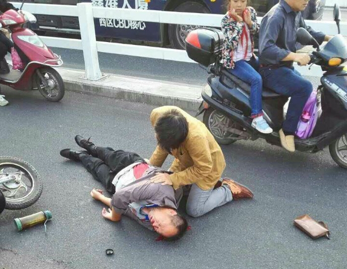 ??? 原來(lái), 今天7點(diǎn)45分左右,朱小平前往醫(yī)院上班途經(jīng)市浮石二橋時(shí),發(fā)現(xiàn)橋上發(fā)生了交通事故,一輛電瓶車和一輛自行車相撞,兩位車主均受傷倒地。因?yàn)槭巧习喔叻迤?,馬路上的行人車輛絡(luò)繹不絕,“傷者就這樣躺在地上十分危險(xiǎn),得馬上實(shí)施急救?!贬t(yī)務(wù)人員的本能驅(qū)使朱小平立即撥打了120急救電話,馬上確認(rèn)兩位傷者的情況,經(jīng)檢查,傷者的生命體征尚平穩(wěn),但其中一位傷勢(shì)較為嚴(yán)重,意識(shí)模糊,頭皮出血多,口腔和鼻孔淤積了許多血塊,為避免引起窒息,朱小平立即給傷者清理了淤血?!安灰ε?,救護(hù)車馬上就到……”朱醫(yī)生一邊關(guān)注著傷者的傷勢(shì),一邊安撫著傷者直到急救車到來(lái),就這樣直到幫助傷者抬上救護(hù)車后才匆匆離開(kāi)事故現(xiàn)場(chǎng)。目前,傷者已被送往市人民醫(yī)院進(jìn)行進(jìn)一步治療。
