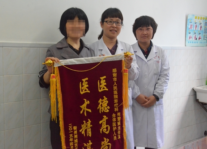 ? “是你們讓我女兒又得到了重生,你們不僅醫(yī)術(shù)精湛,醫(yī)德更是高尚?。 蓖跖繉⒁幻嬗∮?“醫(yī)術(shù)精湛 醫(yī)德高尚”的錦旗送到了我院腫瘤放療科主任何慧娟的手中,并緊緊地握著一直道謝。