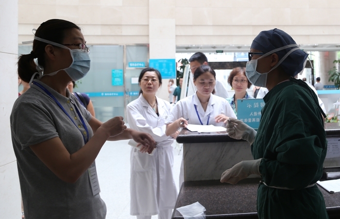 ??? 演練模擬一名從“利比亞疫區(qū)務(wù)工回國人員”,出現(xiàn)了腹瀉、腹痛、惡心、嘔吐、發(fā)燒等癥狀,疑似埃博拉病毒感染,到我院診治的場景。演練考核了醫(yī)護人員的防護穿戴、預(yù)檢分診、標本采集接送、專家會診、病人轉(zhuǎn)院、現(xiàn)場消毒、應(yīng)急響應(yīng)等一系列流程,生動、直觀地展現(xiàn)了防控疫情的全過程。