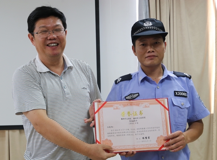 ??? 9月2日,醫(yī)院在院周會上表彰見義勇為、不顧自身安危的保安汪美紅,由院長陳震宏對汪美紅發(fā)布嘉獎令,授予汪美紅“見義勇為”獎。