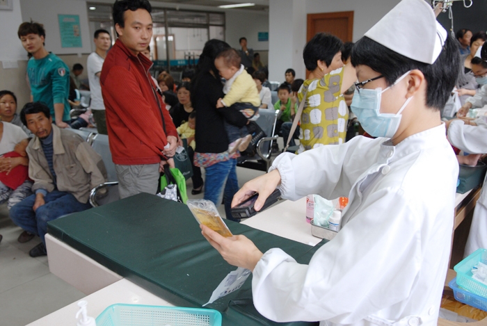 ??? 近日走進我院輸液室的人都會發(fā)現(xiàn),原來排成長隊的現(xiàn)象沒有了,整個輸液大廳井然有序。只見注射臺的護士轉(zhuǎn)身從輸送帶上取下配置好的液體,用掃描儀對準(zhǔn)液體上的條形碼,大廳里就響起了“請**號**(姓名)到**注射臺注射”,此時輪到的患者起身前往相應(yīng)注射臺接受注射。