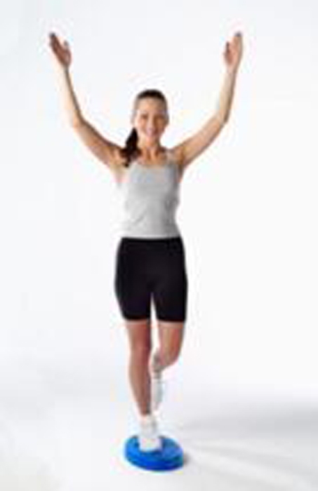 踝關(guān)節(jié)穩(wěn)定性訓(xùn)練(單腳墊上站立)沒有平衡墊的話,家中可用厚枕頭代替。