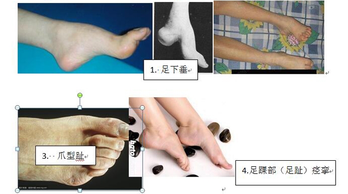 ??? 如下圖:1. 足下垂;2 .高弓內(nèi)翻;3.爪型趾;4.足踝部(足趾)痙攣。