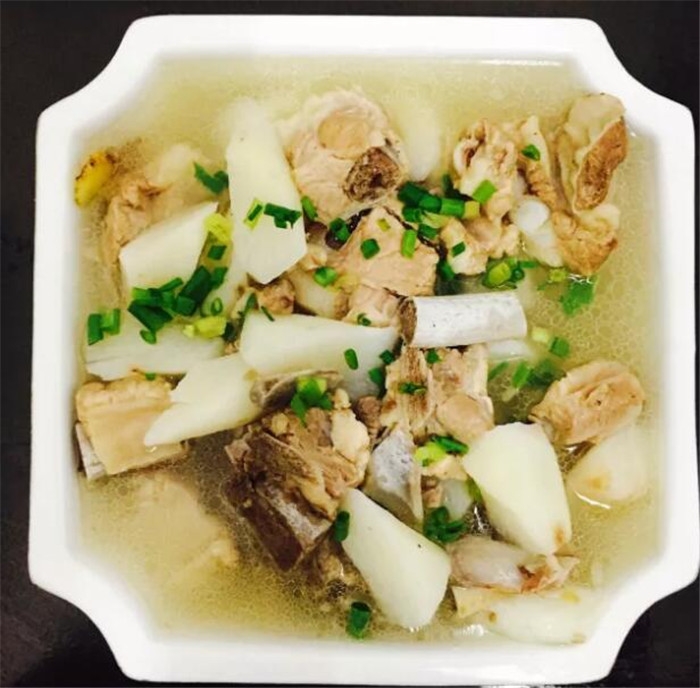 3、待排骨燉至6成熟時,放入山藥繼續(xù)燉約兩個小時,待排骨酥爛時,揀去蔥、姜,放入鹽、味精、胡椒粉即可。