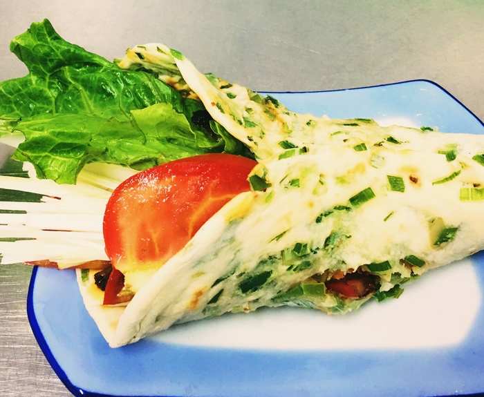 5、? 把面餅放鍋中煎成兩面都呈金黃色,刷上豆醬,放入生菜,雞蛋、肉松、大蔥、西紅柿,卷起即可食用