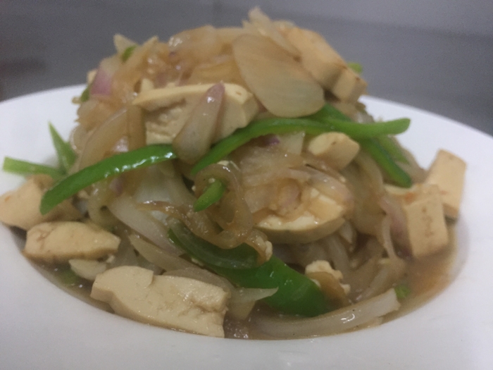 材料:洋蔥200克、豆腐干100克、菜椒等