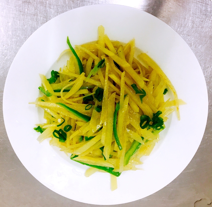 3、? 放入土豆絲和青椒絲,大火爆炒,土豆絲快熟時(shí)放入醬油、米醋、鹽,略炒一下出鍋即可。
