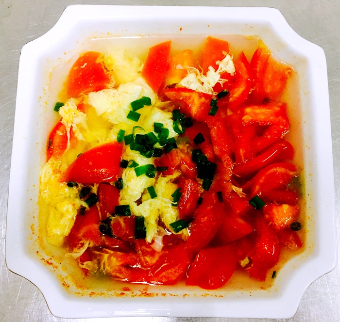 ??? 原料:西紅柿2個、雞蛋1個、肉湯適量、鹽、蔥花