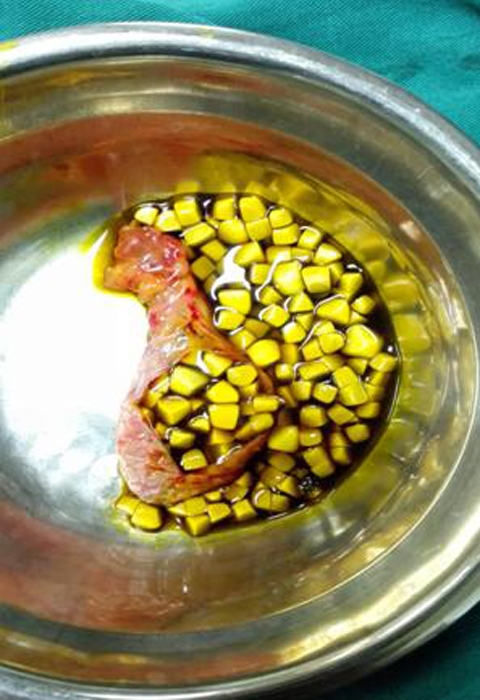 ???? 原來(lái),徐阿姨通過(guò)腹腔鏡微創(chuàng)手術(shù)取出了膽囊,剖開(kāi)后,里面竟充滿了玉米粒樣大小的結(jié)石,多達(dá)100余顆。
