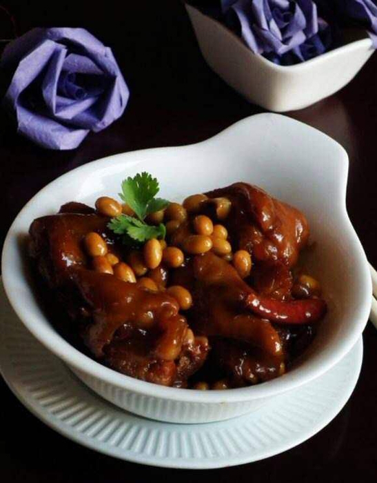 豬蹄塊400克,水發(fā)黃豆230克,八角、桂皮、香葉、姜片各少許。鹽、生抽、老抽、料酒、淀粉、食用油各適量