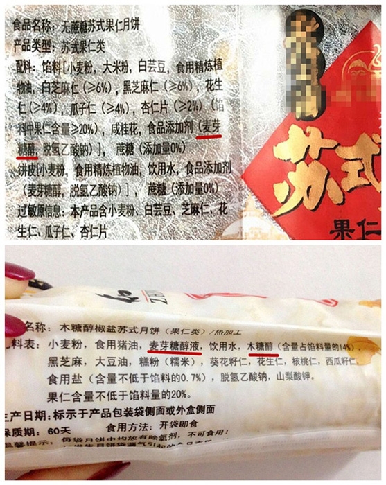 ??? 上圖兩種月餅都號(hào)稱是“無糖”月餅,而在配方當(dāng)中,大家可以很清楚的看到,圖1的“無蔗糖”月餅在食品添加劑當(dāng)中含有“木糖醇”;圖2的“無糖”月餅當(dāng)中也加入了“麥芽糖醇液”。