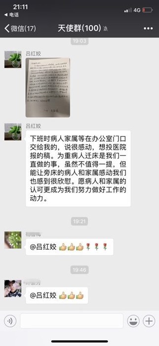??? 19病區(qū)(血液內科)一位患者家屬目睹醫(yī)護人員為了重病人三顧病房做隔壁病床患者遷床的思想工作,被19病區(qū)醫(yī)護人員用心的態(tài)度感動,特地寫信給醫(yī)院院報編輯部,為19病區(qū)醫(yī)務人員點贊。