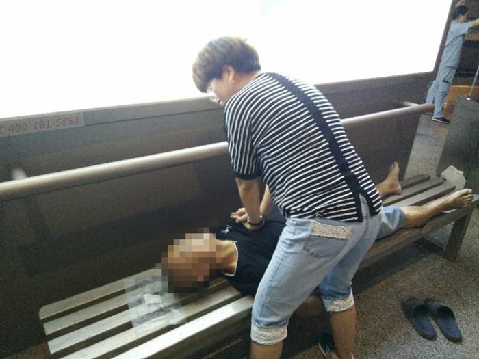 ??? 得知在13車(chē)廂有患者遇到突發(fā)情況。邵微穎立馬從候車(chē)廳跑到站臺(tái)邊,此時(shí),一名成年男子躺在長(zhǎng)凳上,旁邊站著車(chē)站的工作人員。