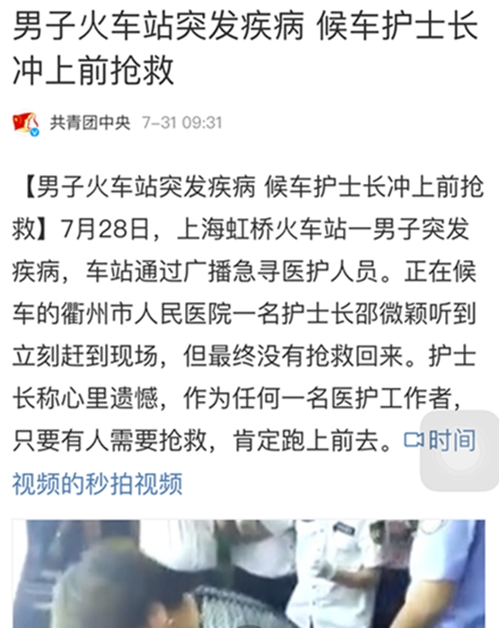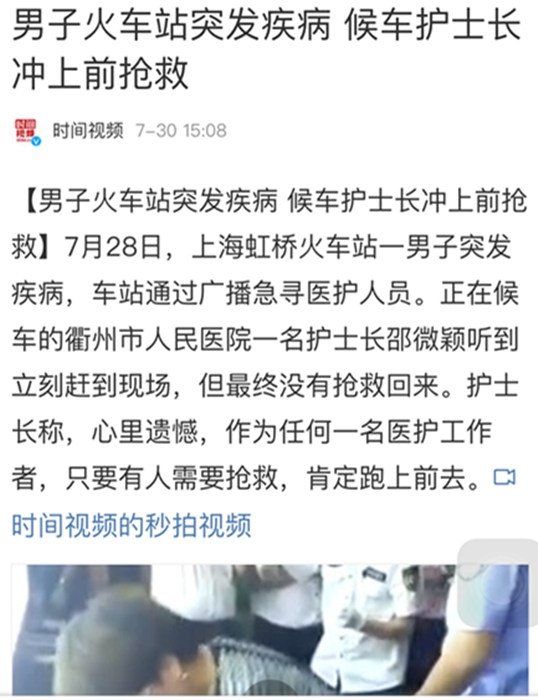 ??? 《男子火車(chē)站突發(fā)疾病? 候車(chē)護(hù)士長(zhǎng)沖上前搶救》 《上海虹橋火車(chē)站? 衢州女護(hù)士長(zhǎng)現(xiàn)場(chǎng)救助陌生人》 《護(hù)士長(zhǎng)帶呼吸膜? 隨時(shí)準(zhǔn)備救人》 《衢州有禮,社會(huì)需要這樣的正能量 》 《衢州有禮,為白衣天使的責(zé)任心點(diǎn)贊》 ……
