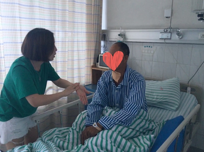 ??? 面對這位情況特殊的患者,醫(yī)護(hù)人員費(fèi)盡了心思。嘗試用紙條交流,大叔不識字,所以在日常照護(hù)中,醫(yī)護(hù)人員不厭其煩地打手勢比劃;沒有家人陪伴,醫(yī)護(hù)人員特別關(guān)注大叔的生活起居,給他請了陪護(hù),一日三餐沒有著落,為他在食堂訂餐……