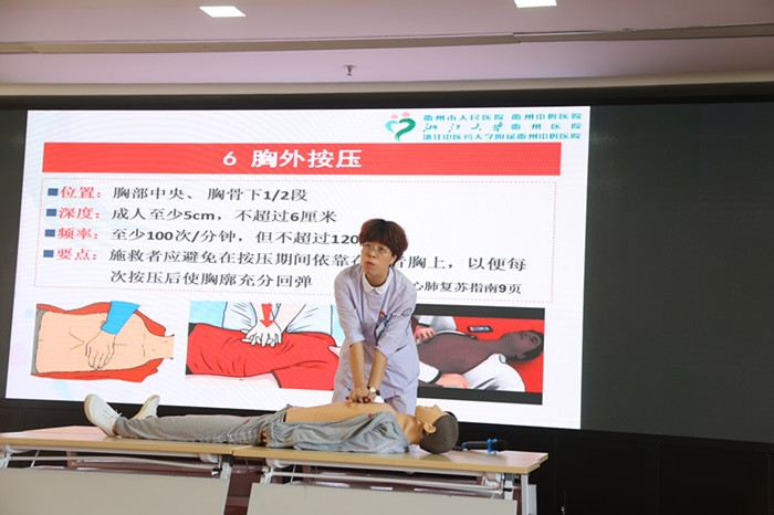 ??? 門急診片護士長邵微穎介紹門診科室布局,并結(jié)合自己多年的臨床經(jīng)驗,開展的急救知識與技能培訓(xùn),詳細講授了救護概念、心肺復(fù)蘇等現(xiàn)場救護知識。她親身示范心肺復(fù)蘇操作程序,選取現(xiàn)場志愿者現(xiàn)場演練,增強了志愿者的救護意識、提高了他們的救護能力,大家感覺受益匪淺。