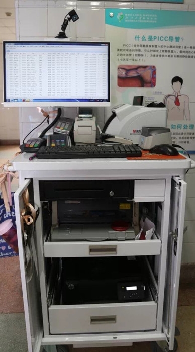 ??? 這臺(tái)移動(dòng)小車(chē),配備有辦公電腦、票據(jù)打印機(jī)、醫(yī)保卡讀卡器等設(shè)備,相當(dāng)于一個(gè)移動(dòng)的收費(fèi)窗口。工作人員來(lái)到病房進(jìn)行結(jié)算,真是既快捷又方便。支持醫(yī)???、銀行卡、現(xiàn)金、微信、支付寶等結(jié)算方式。