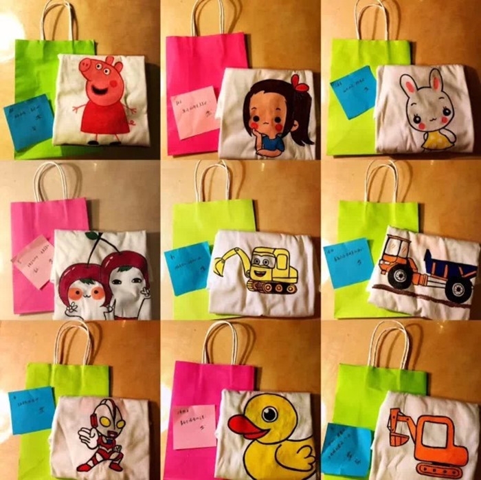 ??? 除了班里的禮物外,胡曉丹還給班里的兩位老師和保育員也畫了可愛的T恤,送給小朋友時,專門準備了可愛的紙袋,還給每個人都寫了一張小紙條表達祝福。