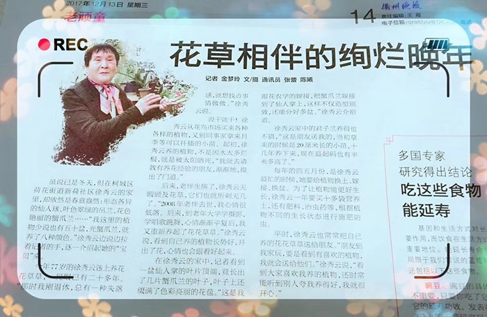 ??? 來到徐秀云老師家,首先映入眼簾的是令人驚喜的小院子,形態(tài)各異的仙人球、葉色翠綠的吊蘭、花色艷麗的蟹爪蘭……“我這里的植物少說也有五十盆,光蟹爪蘭,就養(yǎng)了八種顏色?!毙炖蠋熯呎f邊拉著我們的手,逐一介紹起她的“寶貝”來。