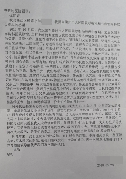 父親患癌治療的5年,醫(yī)生的關(guān)切讓他感恩在心 小學(xué)教師寫近千字感謝信