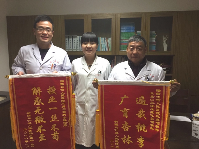 ??? 1月31日,新疆烏什縣人民醫(yī)院五官科副主任焦玲順利完成了在我院的進(jìn)修任務(wù),踏上了回鄉(xiāng)的路途。臨走前,她特地為帶教老師李勝送來(lái)了一面錦旗,“衢烏兩地一家親,感謝衢州市人民醫(yī)院對(duì)我的幫助,我一定要把在衢所學(xué)知識(shí)帶回烏什,更好地為當(dāng)?shù)鼗颊叻?wù)?!苯沽嵴f(shuō)。
