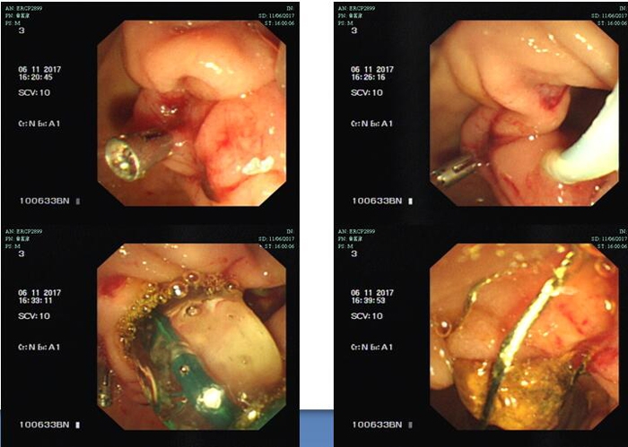 ??? 2014年8月至今,我院肝膽外科在汪正飛副主任醫(yī)師帶領(lǐng)下開展ERCP手術(shù)近700例,開展項(xiàng)目包括:膽總管取石、鼻膽管引流(ENBD)、膽管塑料支架引流(ERBD)、膽管惡性腫瘤金屬支架引流(EMBE)、乳頭檢查+活檢、膽道支架取出、膽道清理、膽道取蛔蟲、腸道金屬支架置入及鼻空腸營養(yǎng)管置入等,為醫(yī)院在肝膽胰系統(tǒng)疾病的診斷和治療方面做出了重大突破。