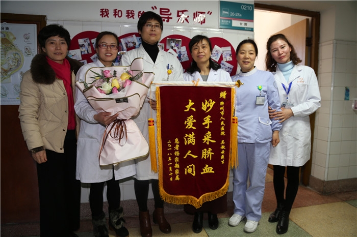 ??? “男童航航(化名)的家人很激動(dòng),一定要叫我代表他們來道聲感謝!”1月17日中午,浙江省臍血庫工作人員余亞圣一行人來到我院,向當(dāng)年采集這份臍帶血的醫(yī)生吳敏云贈(zèng)送了一面錦旗,感謝她采集了高質(zhì)量的臍帶血,并對(duì)捐獻(xiàn)臍帶血的產(chǎn)婦周琦表示感謝。