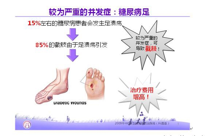 ??? 糖尿病最嚴(yán)重和治療費(fèi)用最高的慢性并發(fā)癥之一,就是糖尿病足。糖尿病足的發(fā)生是由神經(jīng)病變、血管病變和感染共同作用,導(dǎo)致足部的壞死、潰瘍和壞疽。據(jù)統(tǒng)計(jì),15%左右的糖尿病患者會(huì)在其一生中發(fā)生足潰瘍,大約85%的截肢是由于足潰瘍引發(fā)的。