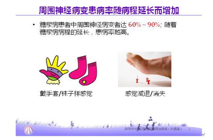????糖尿病周圍神經(jīng)病變與長(zhǎng)期高血糖以及微血管病變有關(guān)。周圍神經(jīng)病變可表現(xiàn)為對(duì)稱性的手套樣或襪套樣感覺(jué)障礙,如麻木、疼痛、感覺(jué)異常、灼熱感,后期可表現(xiàn)為感覺(jué)減退甚至消失。