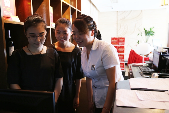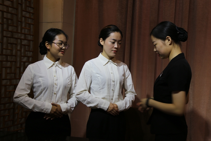 新員工在東方大酒店服務(wù)崗位跟崗,進行服務(wù)禮儀培訓(xùn)