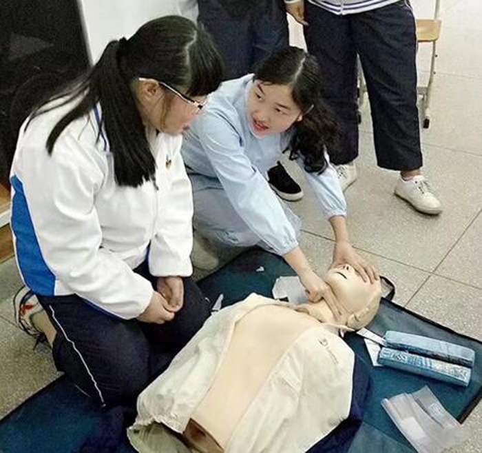 ??? 在進行了心肺復(fù)蘇的公開課后,為了讓同學(xué)們進一步掌握心肺復(fù)蘇術(shù),護士們開始了在模擬人身上的操作。