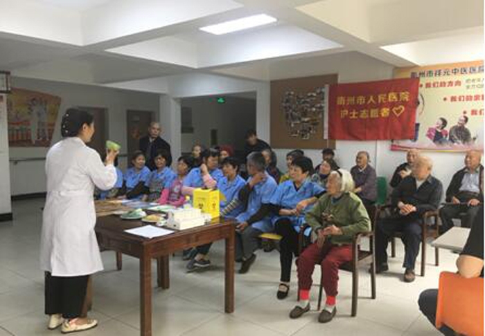 ??? 護士長們?yōu)轲B(yǎng)老院的老人、護工和工作人員進行了老年人安全護理知識培訓,就老年人常見的燙傷、窒息、墜床、壓瘡等問題的預防、處理作了詳細的講解。