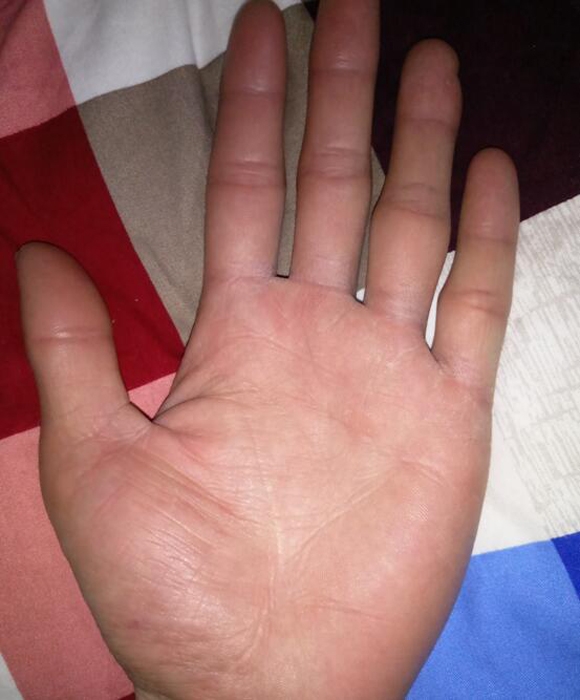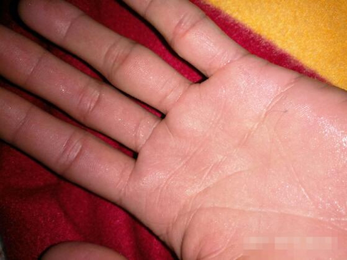 ??? 手汗癥正是多汗癥最常見的臨床表現(xiàn),以雙手汗液分泌異常增多為特點。一般自兒童或少年期時出現(xiàn)癥狀,平均發(fā)病年齡13歲,至青春期癥狀逐漸加劇,50歲以后癥狀又逐漸減輕。手汗癥患者癥狀的出現(xiàn)具有突然性和間斷性,常于情緒緊張、激動、焦慮和運動后、外界溫度升高時加重,睡眠時出汗停止。手汗癥可單獨出現(xiàn),也可伴隨足底、腋窩等其他部位多汗同時出現(xiàn),統(tǒng)計伴腋汗(32.5%),腳汗(46.1%)和體汗(37.8%)增多現(xiàn)象。