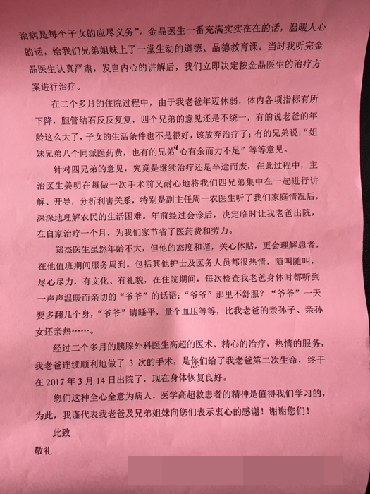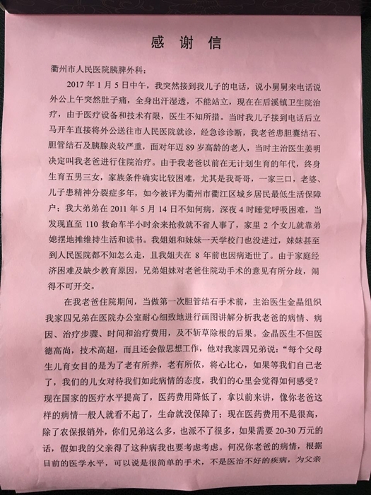 ??? 3月29日一大早,61歲的楊女士專門從柯城區(qū)航埠鎮(zhèn)趕到了我院,將一封紅色的感謝信交到醫(yī)院辦公室的負責人手中,“你們醫(yī)院的醫(yī)生不僅醫(yī)術好,醫(yī)德更好,一定要幫我好好感謝他們?!?/DIV>
